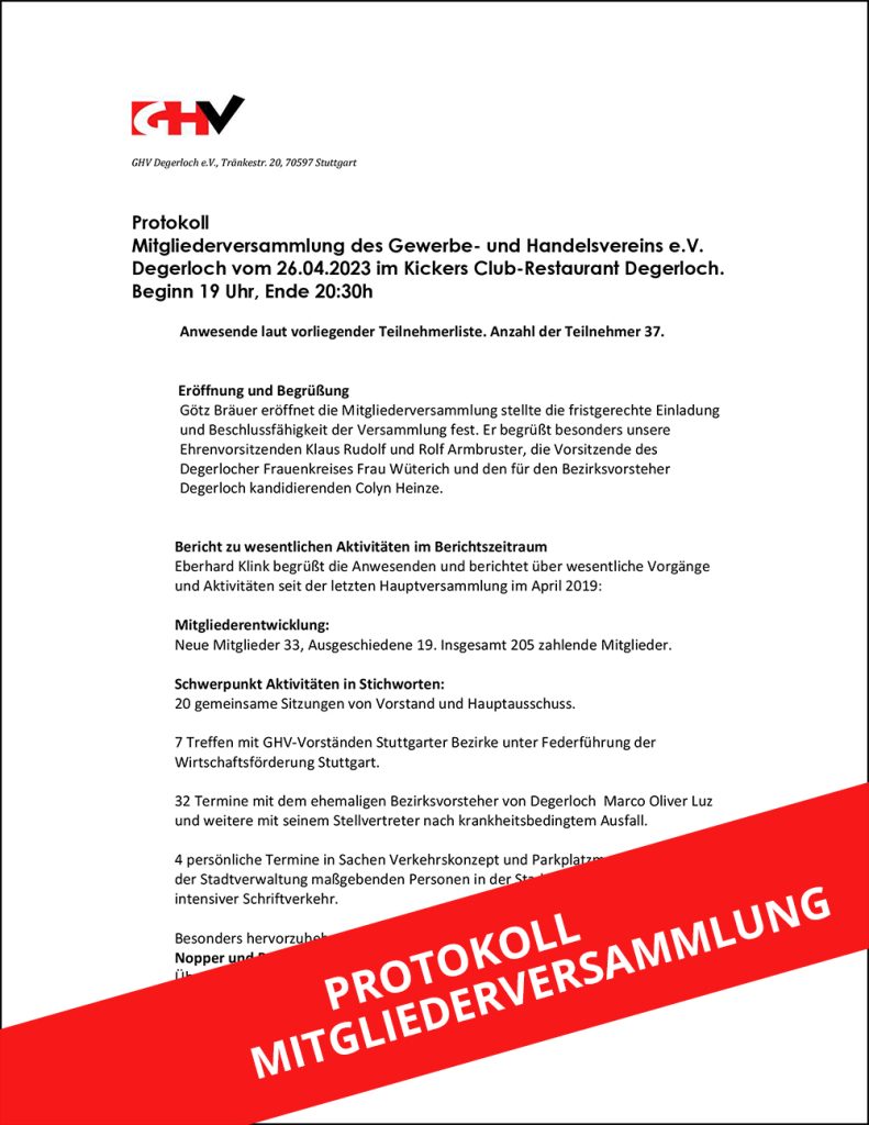 Protokoll der Mitgliederversammlung des Gewerbe- und Handelsvereins e.V. Degerloch vom 26.04.2023 im Kickers Club-Restaurant Degerloch